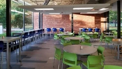 Unique combinations of colors and angles of light for each setting, such as the electric blue backlight at the bar, or the omnidirectional warmth for the cafeteria, help to establish place.