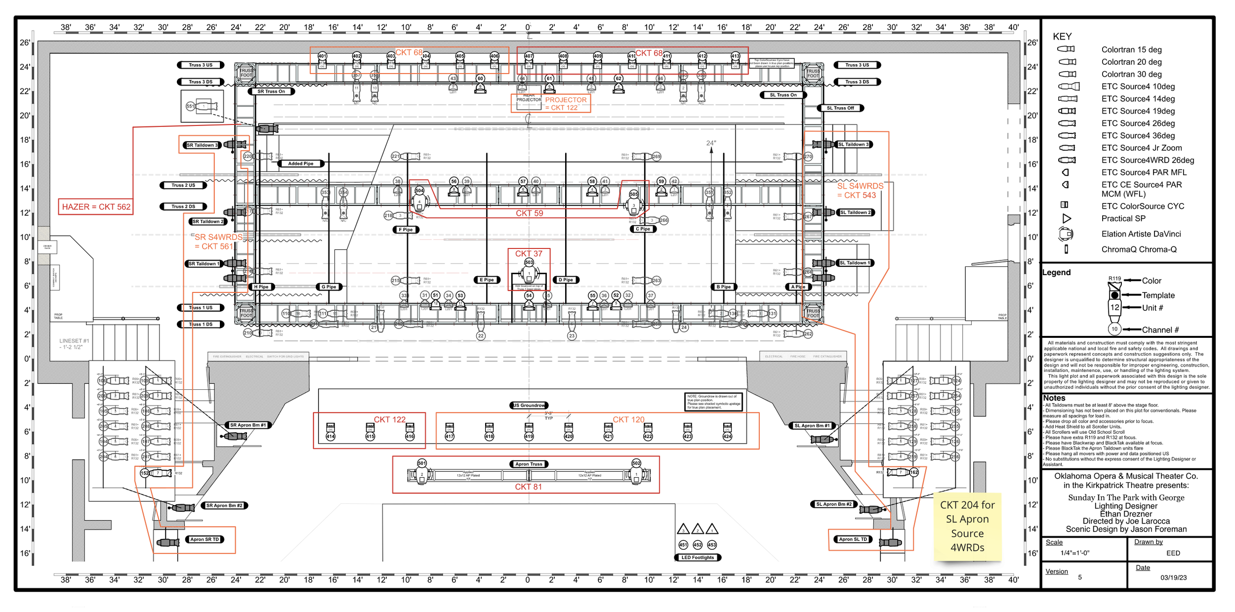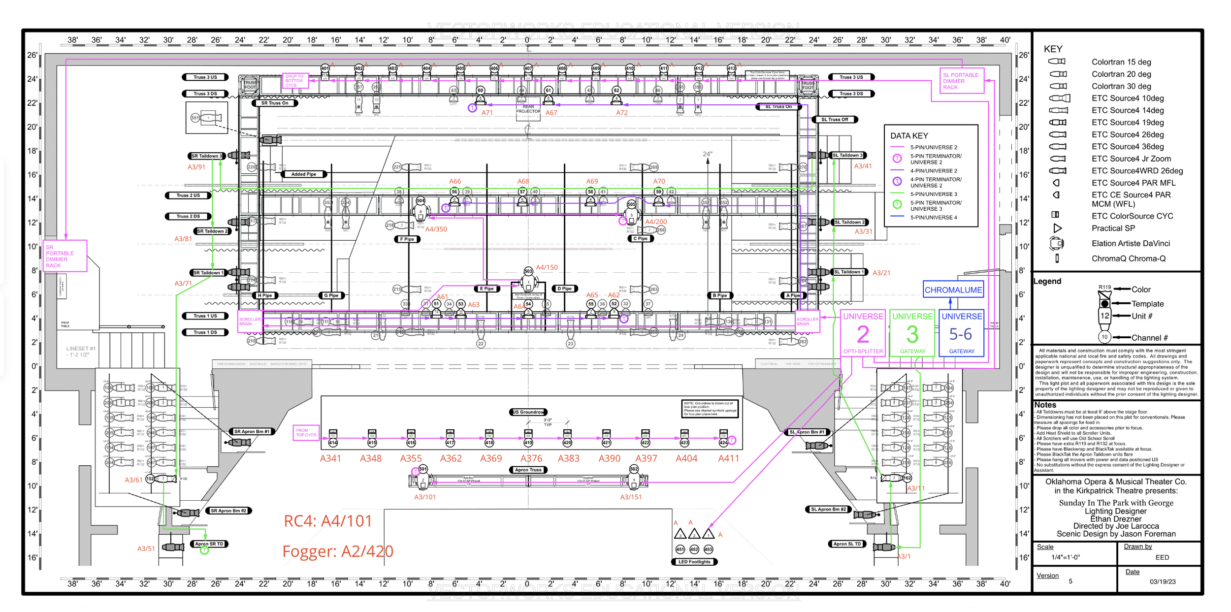 Prepped Plot , showing assigned dimmers, twofers, and marquees for each breakout to assist electricians with hang and circuiting.